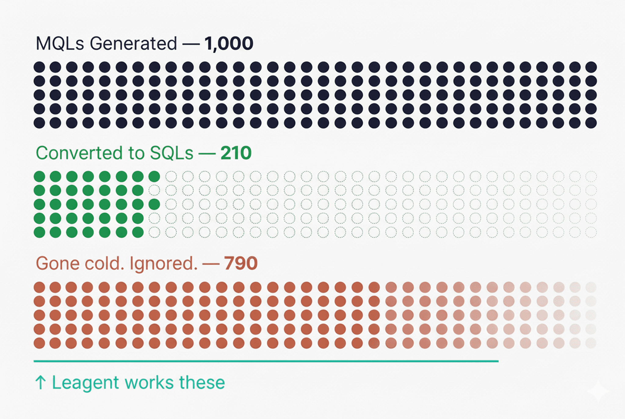 Stop paying for leads nobody follows up on. Leagent detects stale MQLs, writes context-aware follow-ups, and puts them in back in Sales pipelines, so every lead you generates actually gets worked.