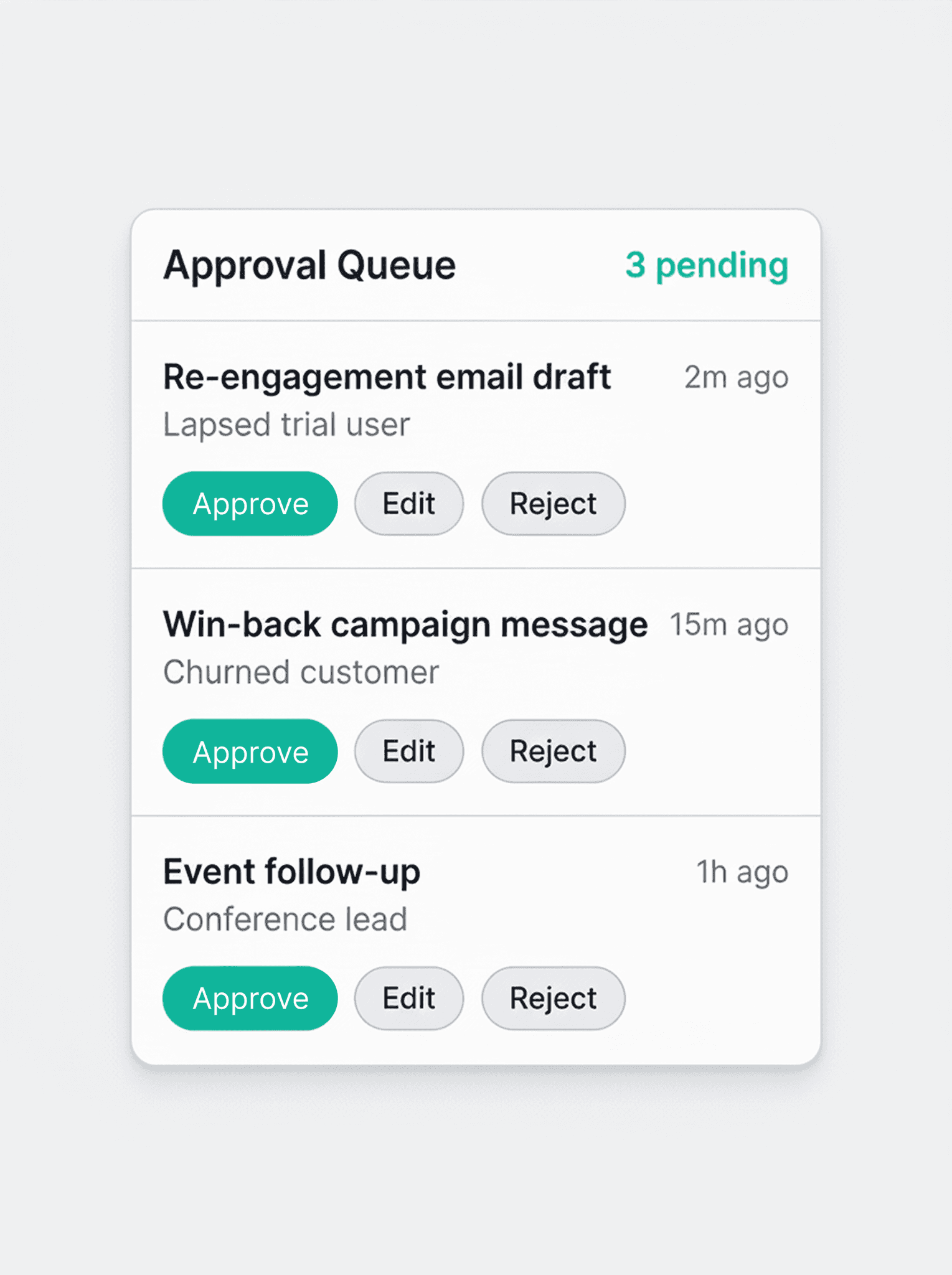 Every email is drafted by AI, approved by you. Your brand voice stays intact.
